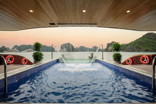 Guests can enjoy immersive experiences such as kayaking, cooking classes, squid fishing, and cultural activities while cruising through the breathtaking limestone landscapes of Halong Bay.