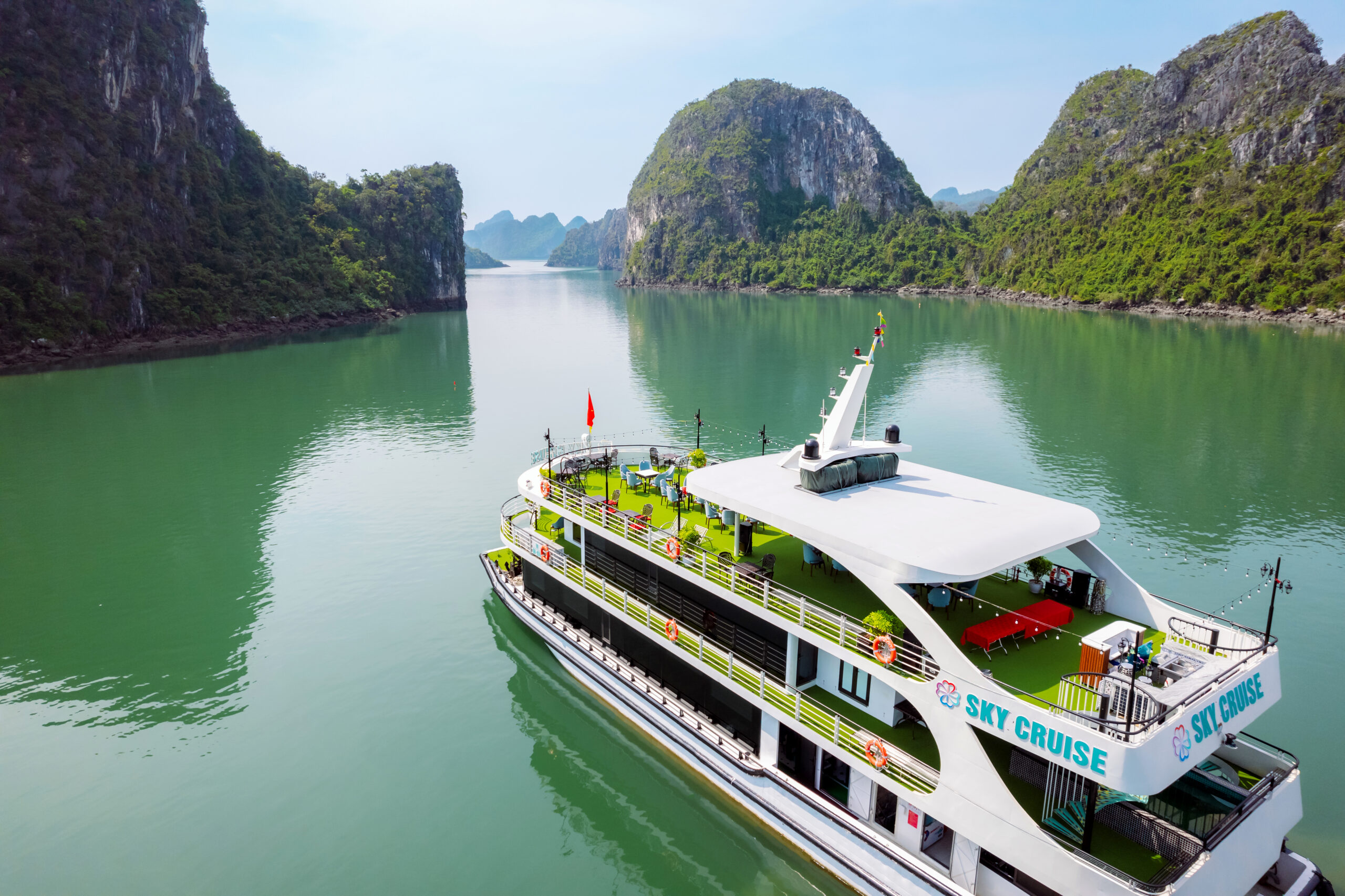 Sky Cruise 99 sets sail toward the heart of Halong Bay.